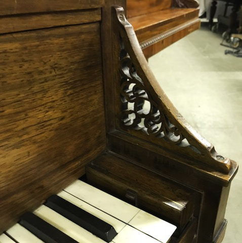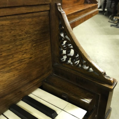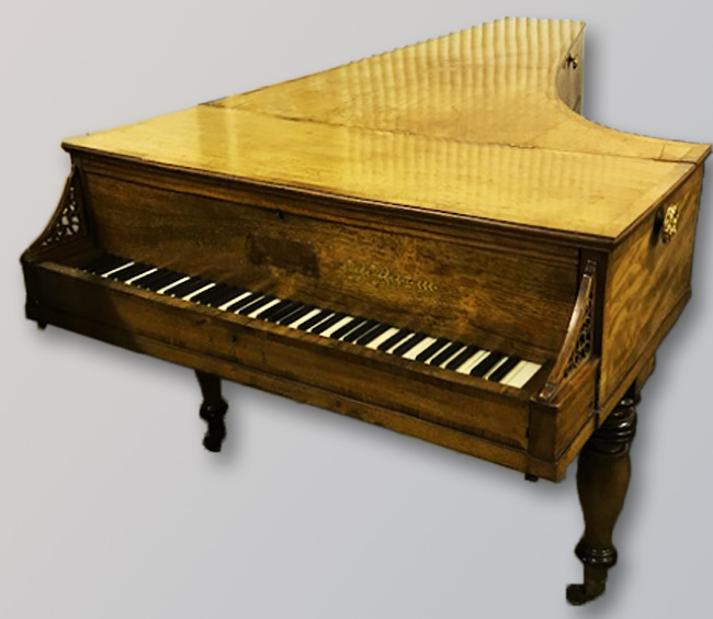 You may have looked up Thomas Tomkison in the reference books, and been disappointed to find not much more than that he operated from 55/77 Dean Street Soho between 1799 and 1851. We now have a lot of new light on his background, his family, and what his contemporaries thought about him, which we are looking to write up in accessible form. Frustratingly little has emerged on his apprenticeship, which we know started in 1778, or on how he practised his trade before he set up shop in Dean Street (when he would have been a man of 35). Recent research shows, however, that in late 1798/early 1799 Tomkison emerged as successor to the bankrupt piano-making business of James Henry Houston, and that there are striking similarities between the first products of Tomkison’s workshop and surviving instruments of Houston. Within a few years of operation, Tomkison succeeded in making himself s a rival respected by Broadwood and Clementi for the sheer quality of his pianos. He made instruments not only for the Prince Regent, later George IV, but for at least two other royal courts in Europe, knew all the leading makers and pianists in London, was on friendly terms with the Erard and Pleyel dynasties in Paris, and enjoyed a reputation as a connoisseur of pictures as well as music. Though we do not know of any technical improvements to the mechanism of the piano that he himself innovated, we can document his inventive use of distinctive and often striking elements, such as half size dustboards, pioneering the use of four, not six, leg square pianos (and three, not four on grands), making a remarkable 6.5 octave square as early as c.1824 and exploiting the string plate as a striking decorative feature. As witness to his commercial acumen as well as their structural stability, his pianos were widely exported to India, the Americas and Australia. Contemporary sources regularly class him with the leading English builders Broadwood, Clementi and Stodart. Thomas Tomkison serial number 1112 is the earliest of five known surviving Tomkison grands in the ‘French style’, having decorative fretwork or metalwork at the keyboard ends, and three rather than four legs or a stand. These five instruments are:
