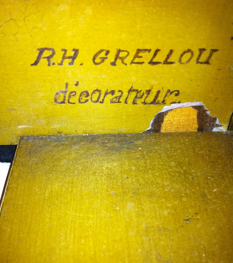 Art work Executed and signed by famous interior Decorator and known artist, R.H. Grellou, (Raymond Grellou) known for his passion for ornamental designs and decoration of the Italian school of the XVI , XVII and XVIIIth centuries, the French school of the XVIII th century, and inspired by and attributed to names such as Claude Audran III, Henry Augustus Jean Berain, Ferdinando Bibiena, Juste-Nathan-François Boucher, Paul Cauvet Gilles, Jean-Charles Delafosse, Jean-Demosthenes Dugourc, Nicolas Pineau, Jean-Louis Prieur, Pierre Ranson and Henri Salembier. Among his customers were luxury names such as Henry Ford II (1956) and Hector Lefuel. Grellou was active in Paris from 1925 till his death in 1965. Qualified as an entrepreneur in interior decorating, he is also know as a collector of art and is well noted within many collections today such as the Frick collection.