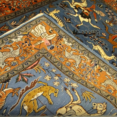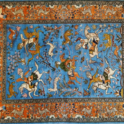 Motifs of Iranian hunt using natural colors of Navy blue, gold, yellow, and creamy white. Orange, Brown and Pink background areas. Representing the hunt, showing deer and jackals from the Safavid period.