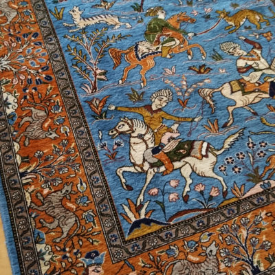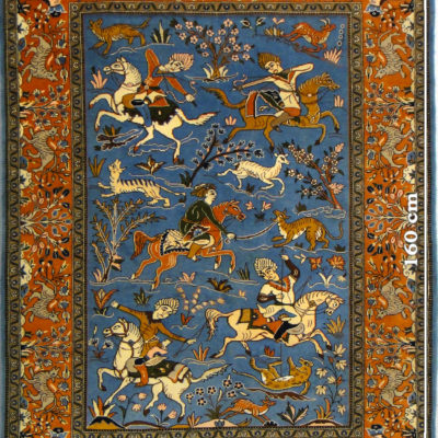 The design refers to the Safavid Period (1501–۱۷۳۲) of ancient Persia. Five noblemen on horses with bows, sabres, spears, are hunting chamois, deers, tigres, wild cats and other animals. The background is held in a friendly sky-blue, and a fertile landscape with blossoming trees and flowers is the playground for the noble riders. In the four edges of the terracotta-coloured border four hunters are kneeing with bows.