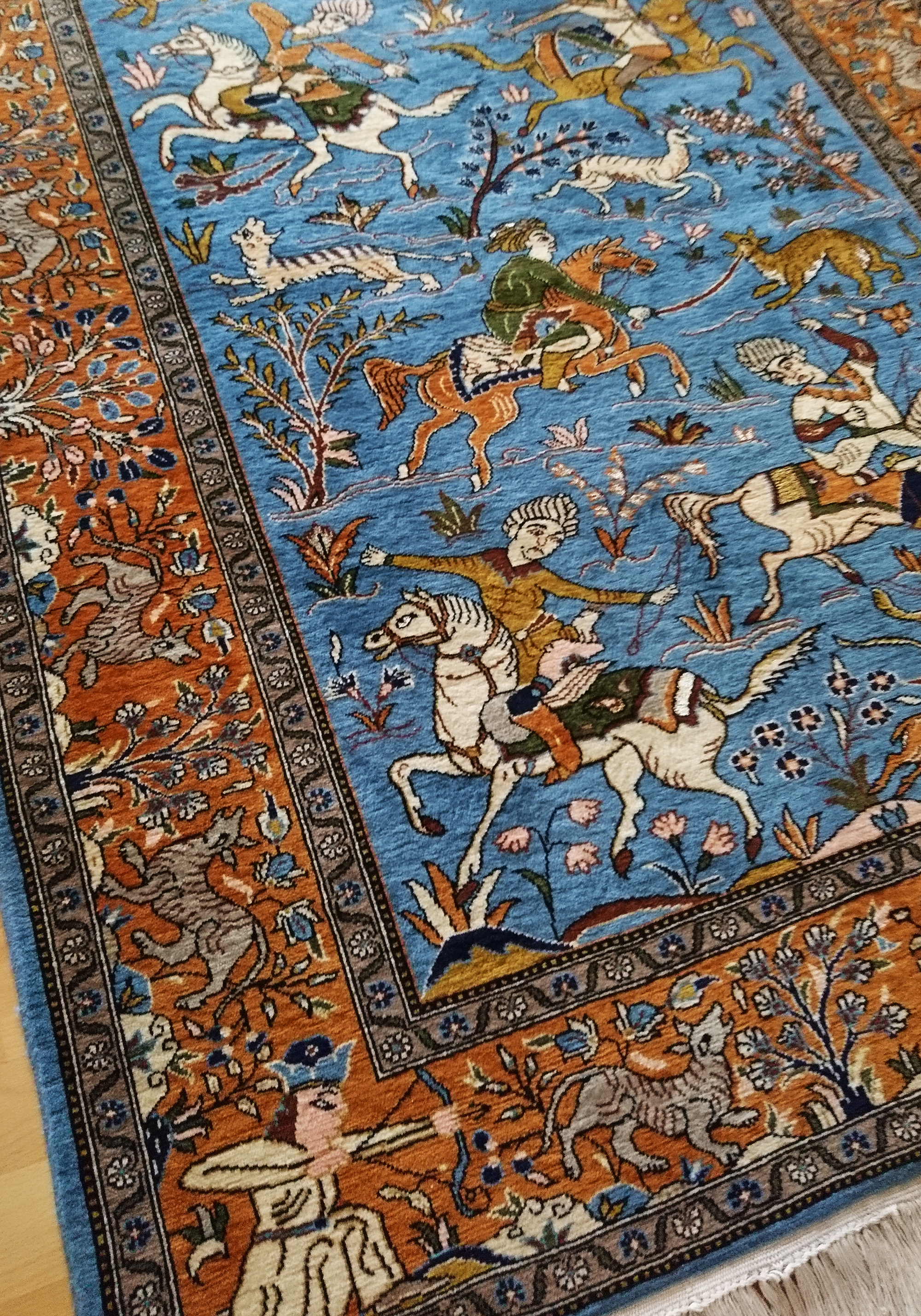 The design refers to the Safavid Period (1501–۱۷۳۲) of ancient Persia. Five noblemen on horses with bows, sabres, spears, are hunting chamois, deers, tigres, wild cats and other animals. The background is held in a friendly sky-blue, and a fertile landscape with blossoming trees and flowers is the playground for the noble riders. In the four edges of the terracotta-coloured border four hunters are kneeing with bows.