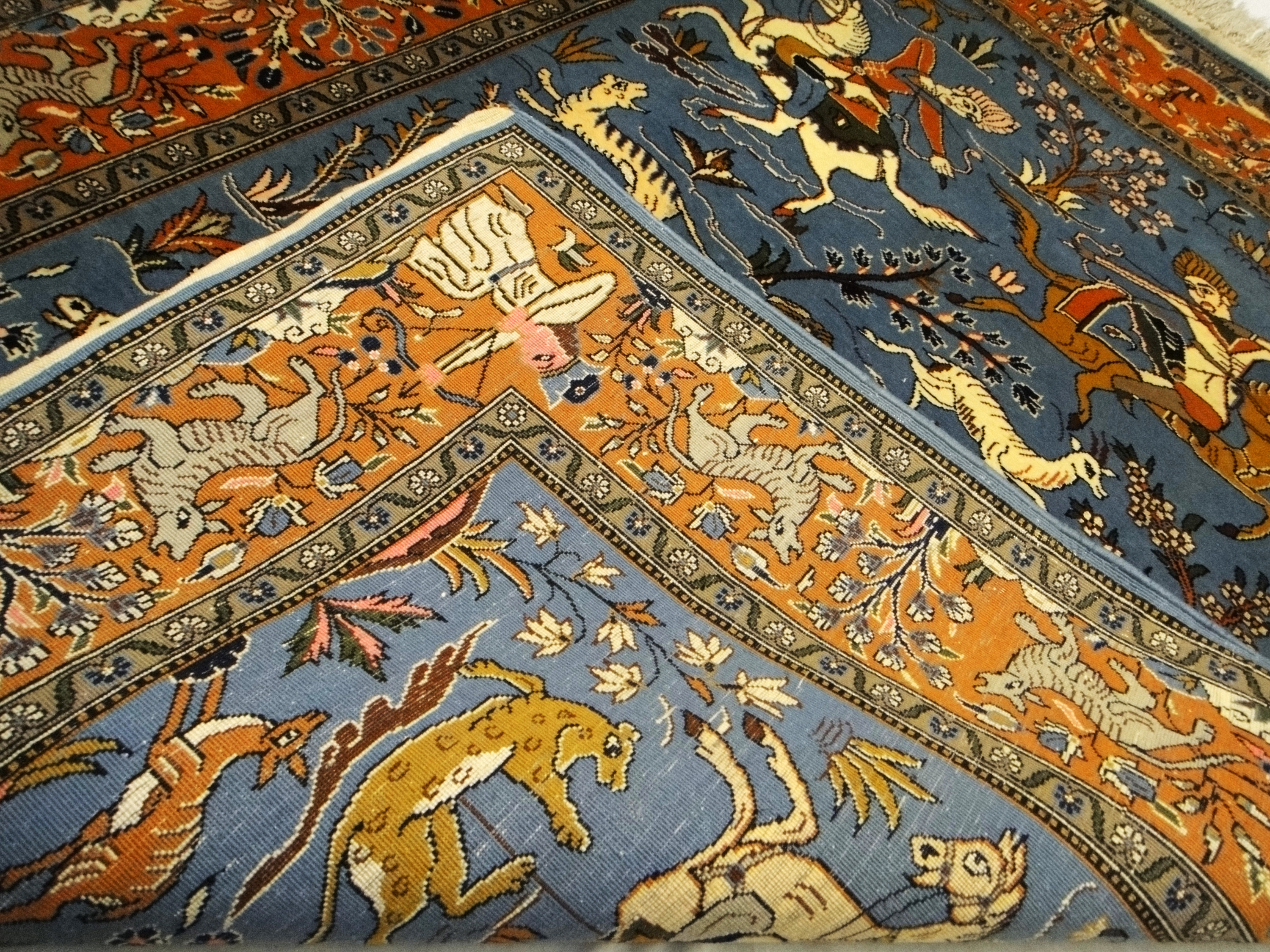 Motifs of Iranian hunt using natural colors of Navy blue, gold, yellow, and creamy white. Orange, Brown and Pink background areas. Representing the hunt, showing deer and jackals from the Safavid period.