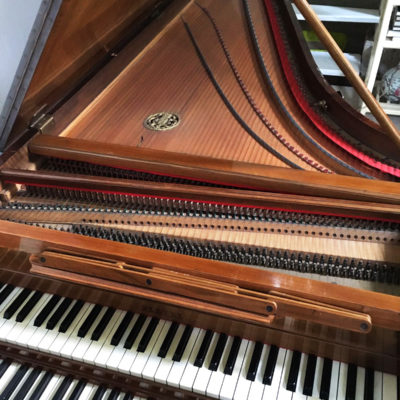 This Pleyel harpsichord is not an exact copy of instruments from the renaissance or baroque periods. According to Pleyel, its construction was based on “old theoretical documents” and also on the “study of a large number of seventeenth and eighteenth-century instruments preserved intact in collections, particularly those of master builders like Ruckers, Couchet of Antwerp, Blanchet and Pascal Taskin”. Though its construction was inspired by historic instruments, the sober Mahogany and rosewood veneer of the case is more reminiscent of an early pianoforte. Some described the instrument as a “plectrum piano” rather than as a harpsichord.